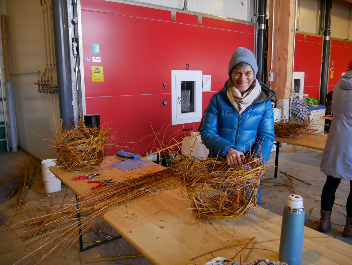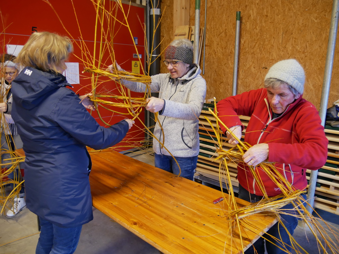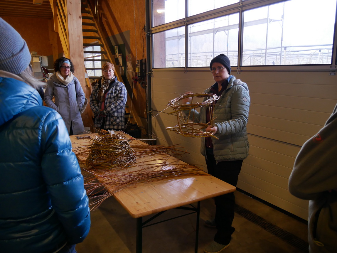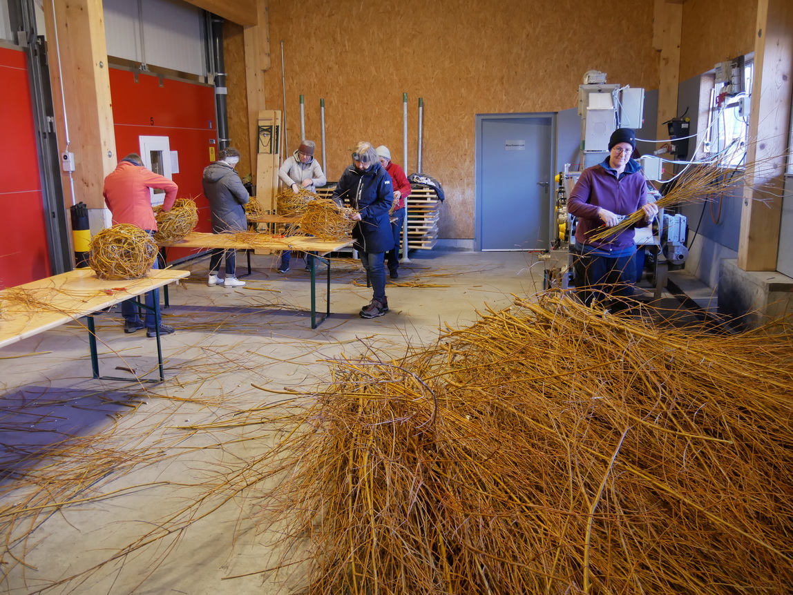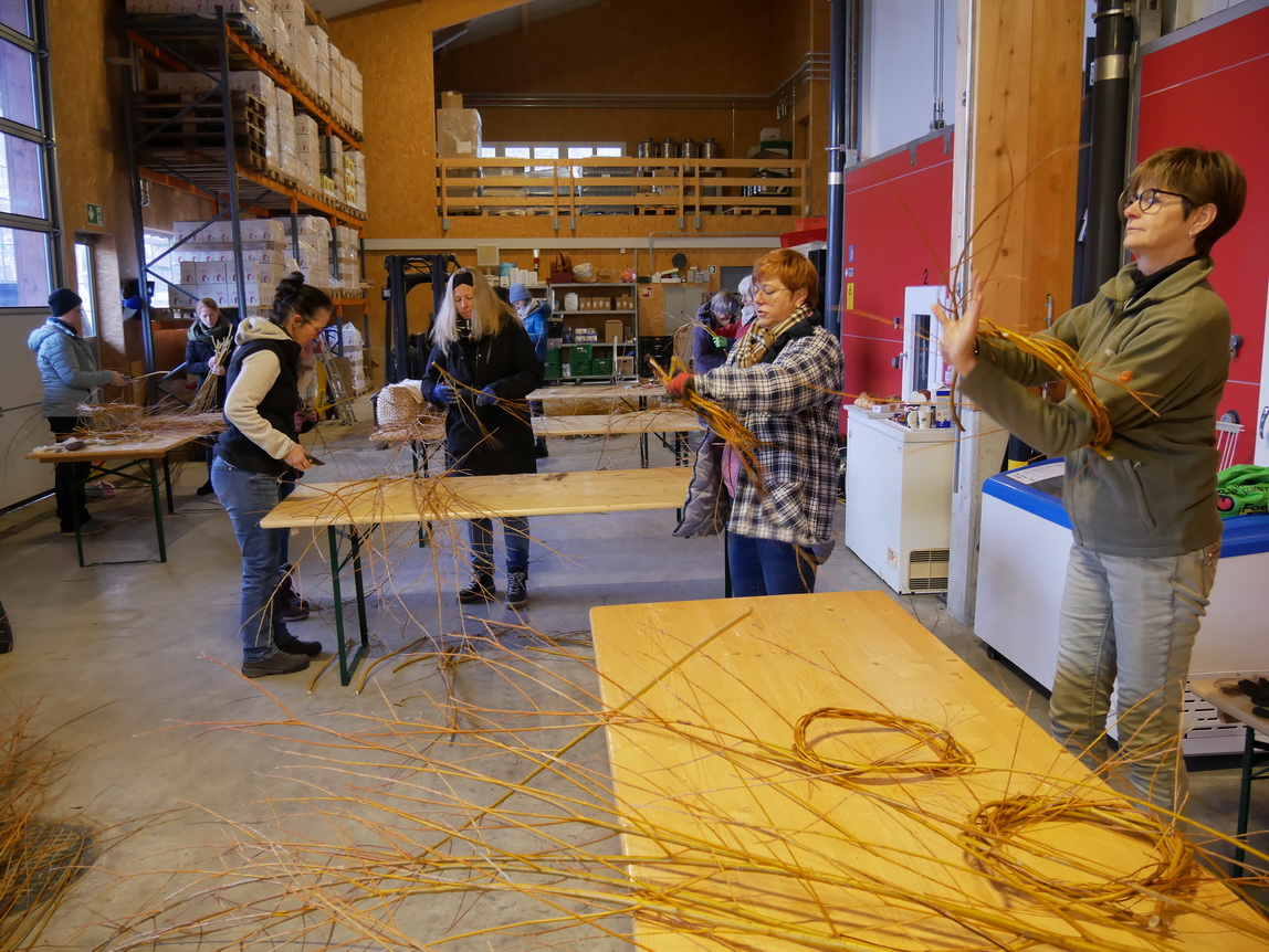 Einen Tag nach dem Schneiden der Weiden im Looch, am Samstag, dem 08.02.25, traf sich eine Gruppe aus 14 Frauen und einem Kind zu einer weiteren großen Aktion: Die frischen Weidenzweige konnten in einem Weidenflechtkurs unter Anleitung von Franzi und Therese zu Körben und „Übertöpfen“ verarbeitet werden.
