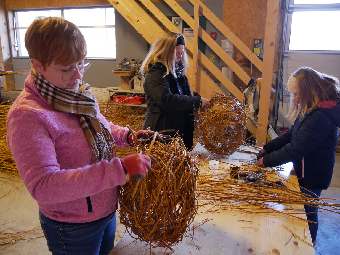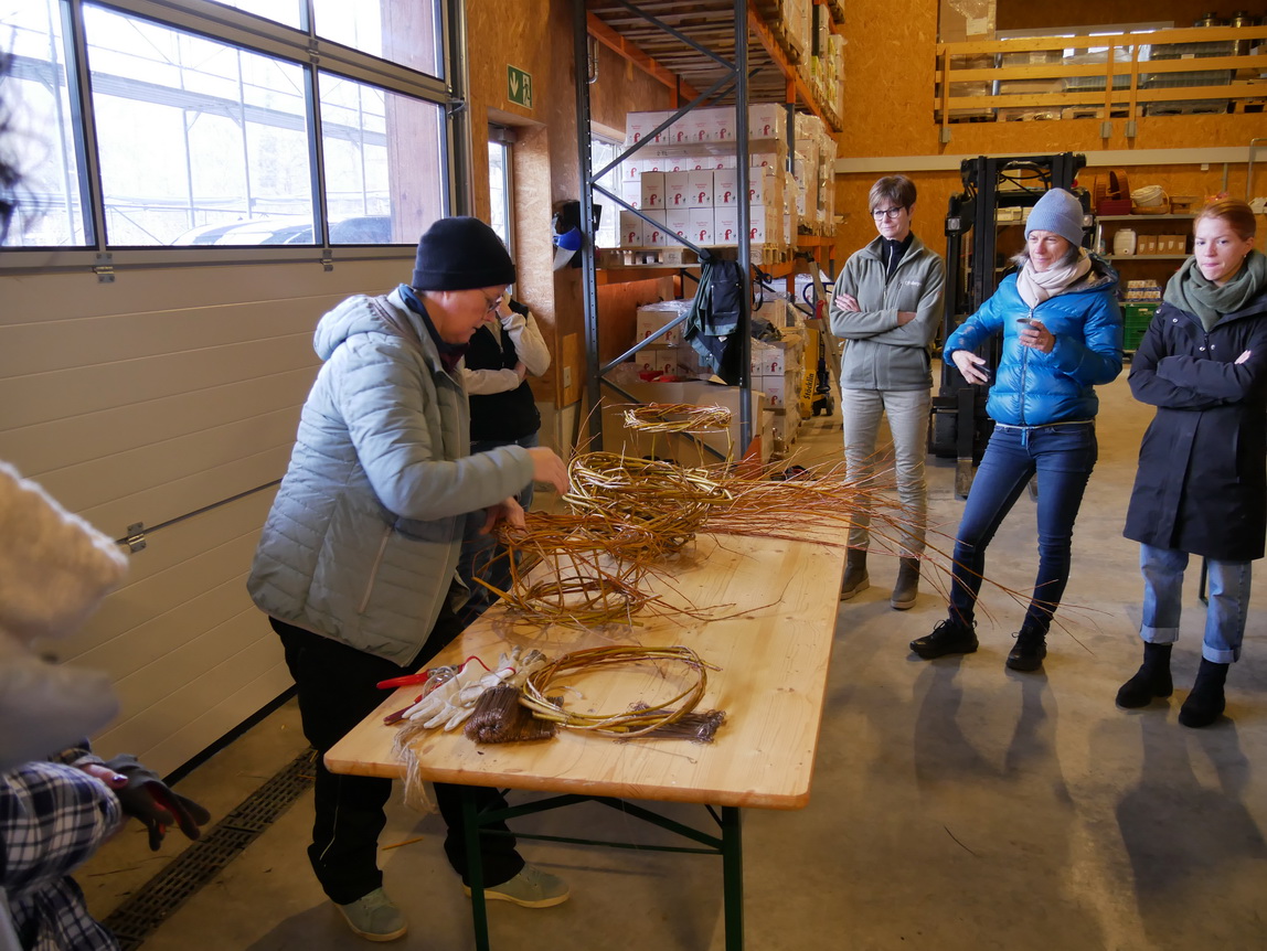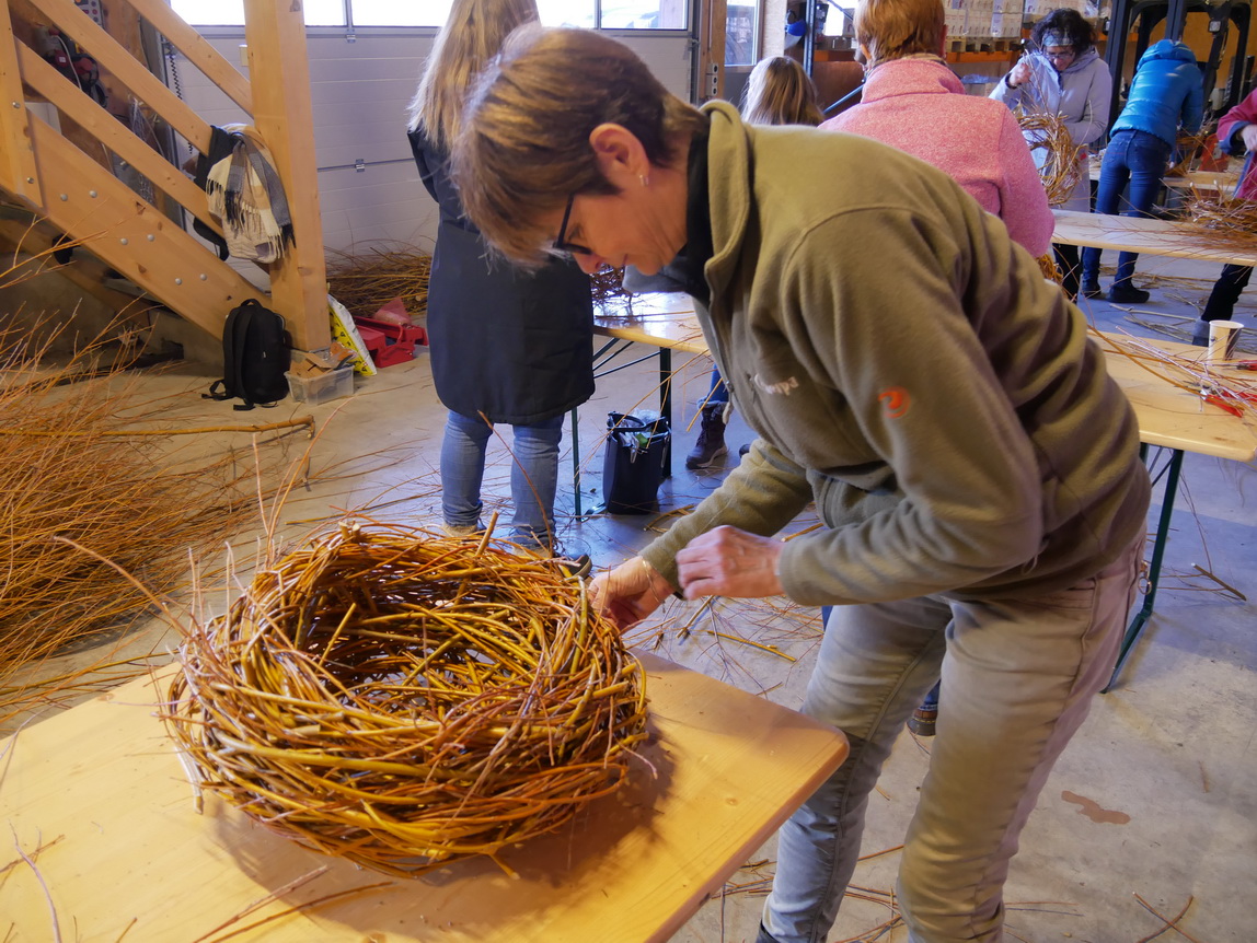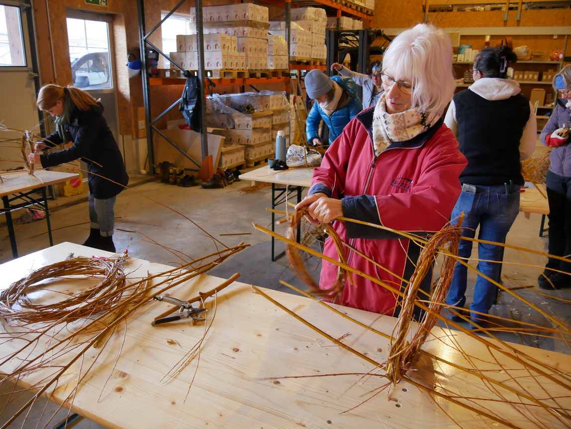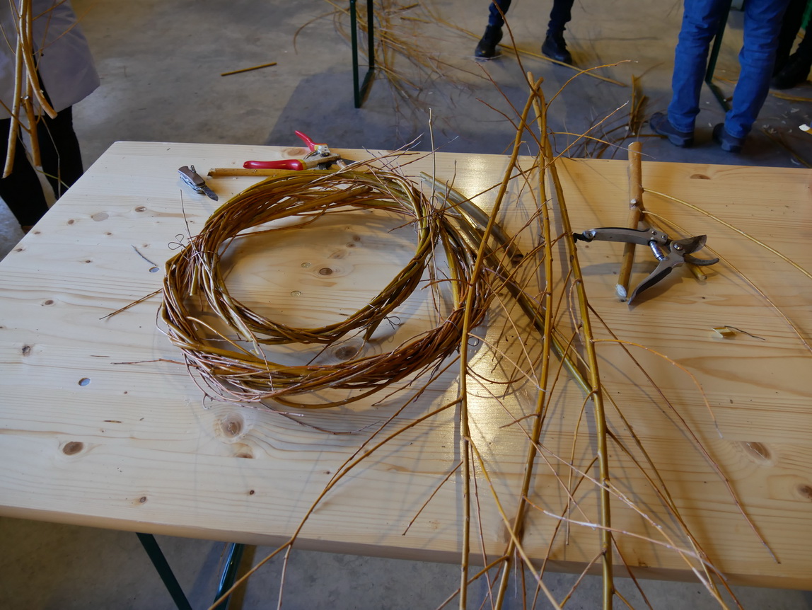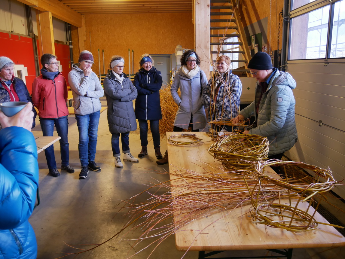 Einen Tag nach dem Schneiden der Weiden im Looch, am Samstag, dem 08.02.25, traf sich eine Gruppe aus 14 Frauen und einem Kind zu einer weiteren großen Aktion: Die frischen Weidenzweige konnten in einem Weidenflechtkurs unter Anleitung von Franzi und Therese zu Körben und „Übertöpfen“ verarbeitet werden.