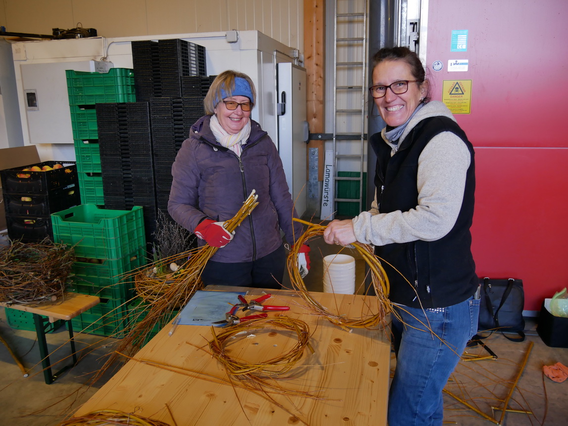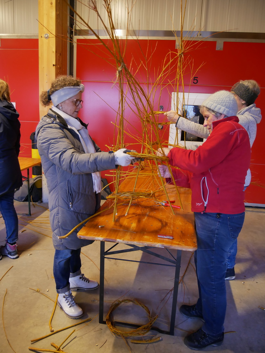 Auch hier zeigte sich, dass es einiges an Geschick und Geduld erforderte, die Zweige in die gewünschte Form zu bringen. Es war schnell ersichtlich, wer schon Übung mitbrachte. Die gegenseitige Hilfsbereitschaft war groß, die Atmosphäre sehr entspannt. Die angesetzten 2 Stunden waren sehr schnell vorbei. Die meisten Teilnehmerinnen blieben eine weitere Stunde vor Ort und nahmen dann noch Zweige mit heim, um dort die letzten Lücken zu schließen. Es entstanden sehr schöne, individuelle Kunstwerke, die sicher bald vor einigen Türen in Ramlinsburg gefüllt mit Blumen und anderen Pflanzen bestaunt werden können. Der Wunsch nach einer Fortsetzung wurde schon geäußert, was uns darauf schließen lässt, dass der Kurs auch anderen genauso gut gefiel wie uns. Wir danken Franzi und Therese für diese schöne Aktion!