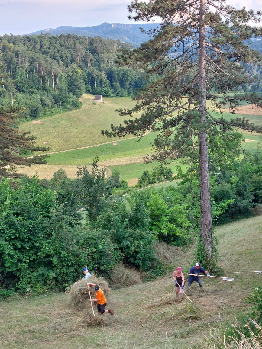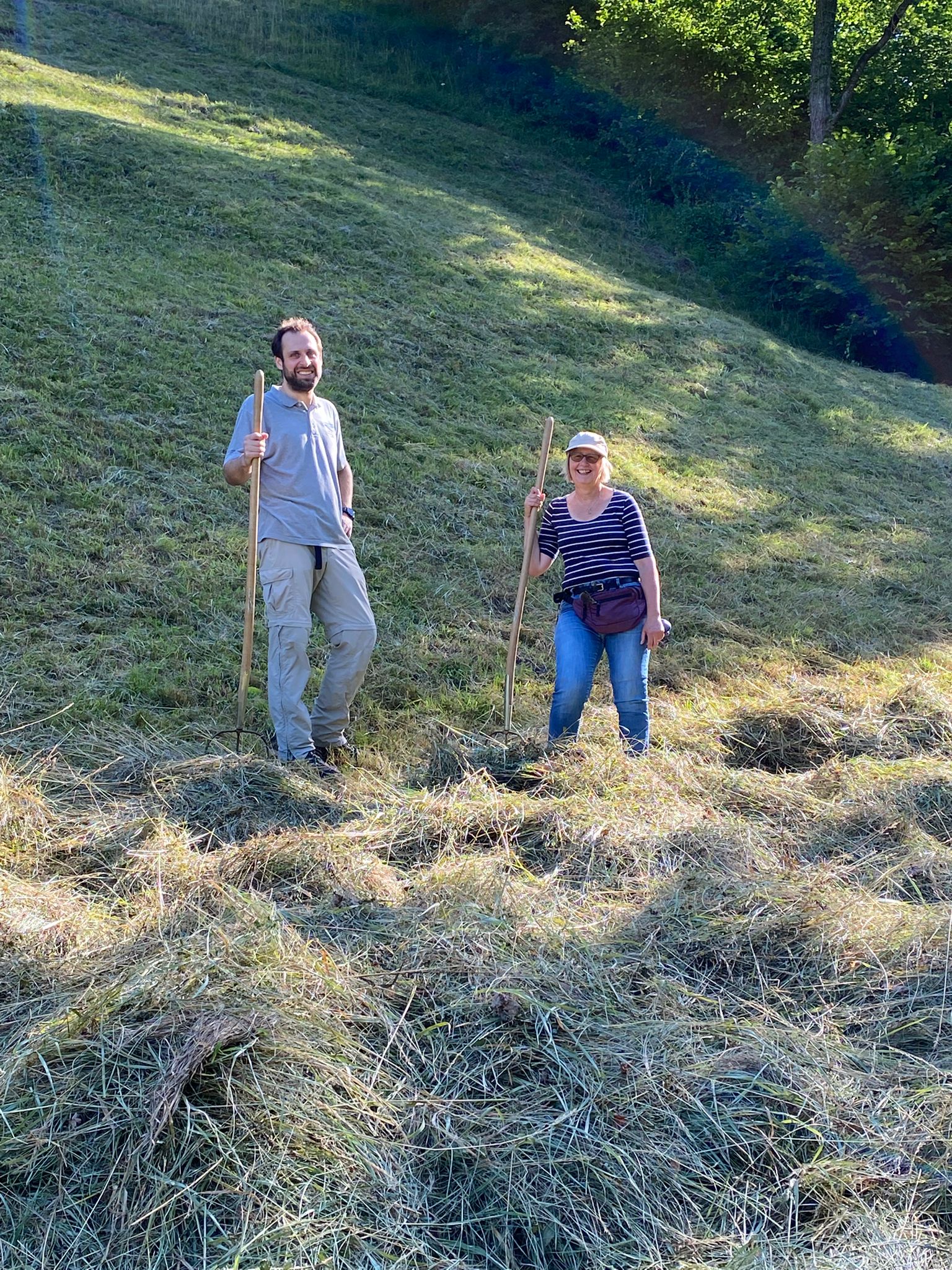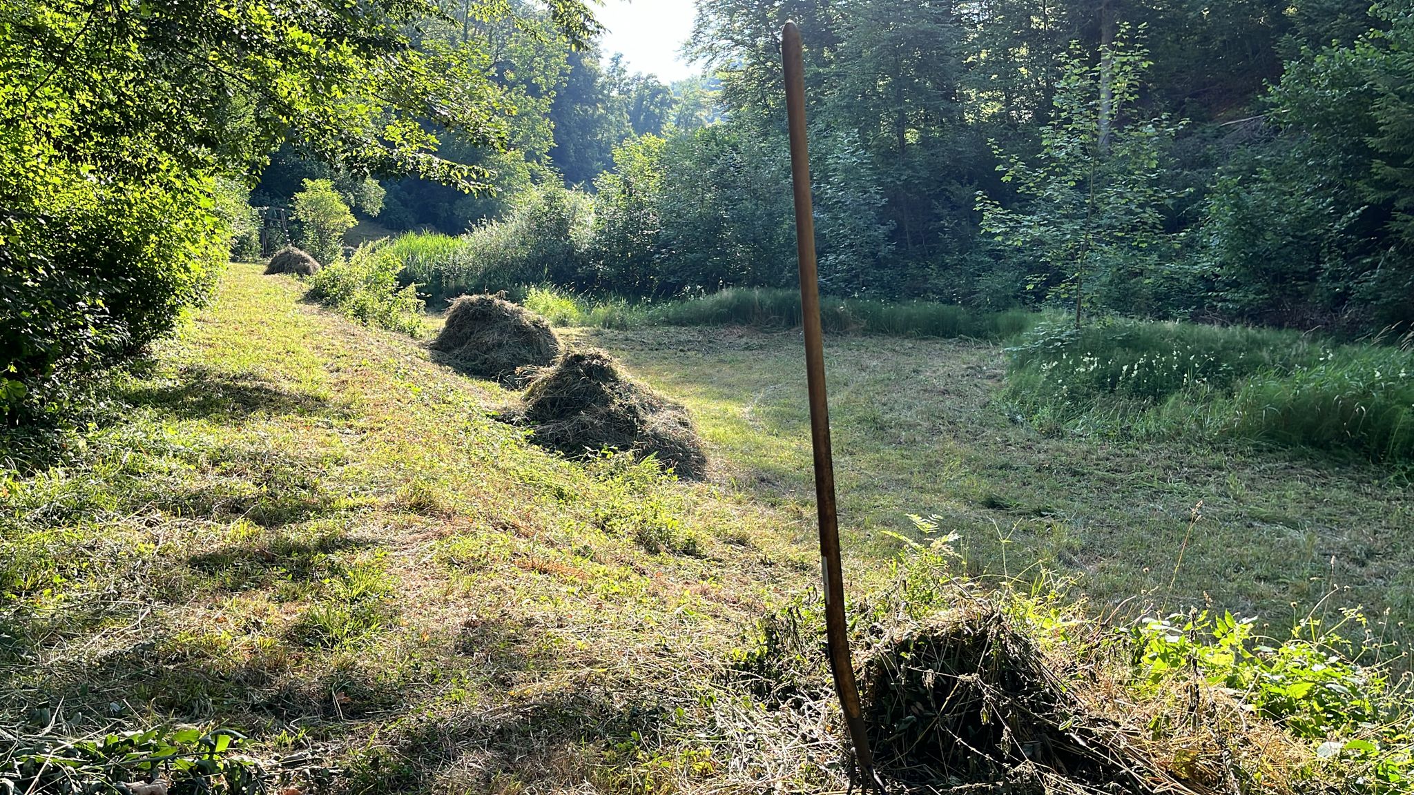 In der Buechen und der Bodenrüti mussten Ackerkratzdisteln und Berufskraut entfernt werden. Kurz darauf konnte dann im Looch und der Bodenrüti gemäht werden. Bei großer Hitze leisteten Manuel und Markus die Vorarbeit- vielen lieben Dank! - sodass die Helfer*innen dann in den Abendstunden, in denen es zumindest etwas kühler war, das Schnittgut zusammennehmen und auf Haufen verteilen konnten.